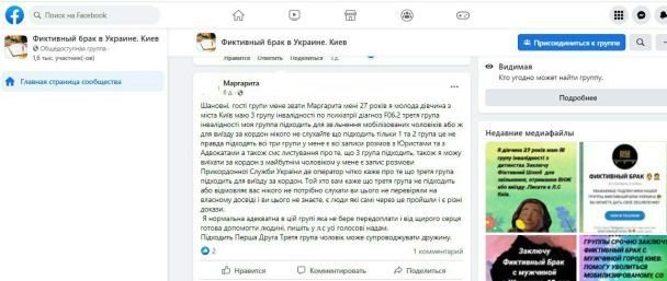 Як з’ясував ТСН.ца, в соцмережах наразі створено спільноти, де розміщені оголошення з пропозиціями укласти фіктивний шлюб для виїзду військовозобов’язаних за кордон. За укладання такого шлюбу між військовозобов’язаним та жінкою, яка має інвалідність, пропонується від 8 тис. грн. до 20 тис. грн.