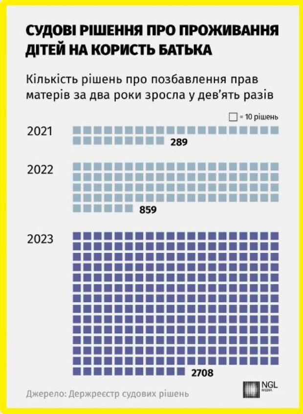 Повідомляється, що кількість судових рішень про позбавлення матері батьківських прав та передачу дитини на виховання батькові за 2022 та 2023 роки в рази зросла.