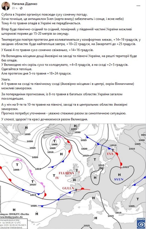 Наталка Діденко попереджає, що вже найближчої ночі, 4-5 травня, на сході та північному сході, а також місцями та в центральних областях, окрім Вінницької області, можливе відчутне падіння температури, а на поверхні землі можуть бути заморозки.